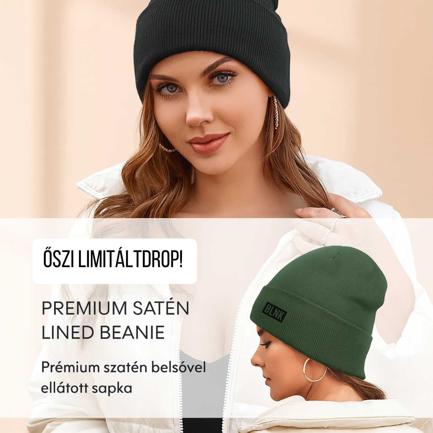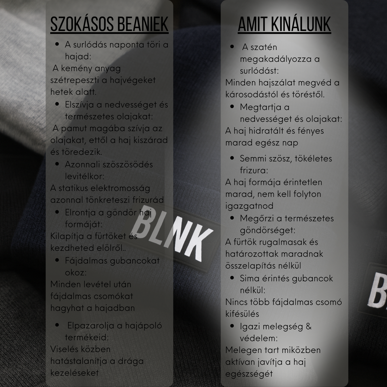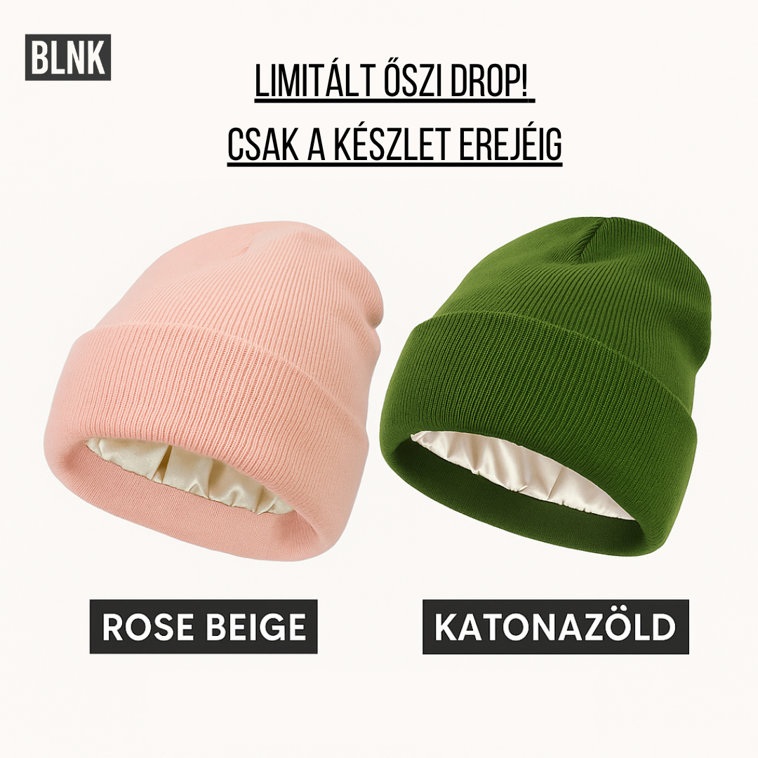 A BLNK sapka prémium, rugalmas kötött anyagból készült, belül selyemhatású szatén béléssel.